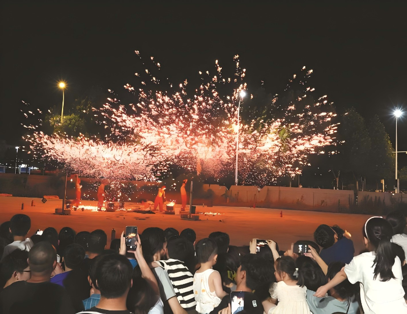 夜幕降临,华灯初上。当晚,在巢湖华熙广场,人山人海,热闹非凡,不少市民、游客早早来到这里等待观看表演。晚上8时许,在众人的期待中,民间艺人一人舀起铁水抛向空中,另一人则用力击打空中的铁水,铁水瞬间向空中四溅,形成烟花效果,如流星般漫天划过,亮如白昼。“铁花火雨”“火树银花”景观,惊艳了久久等候的观众。