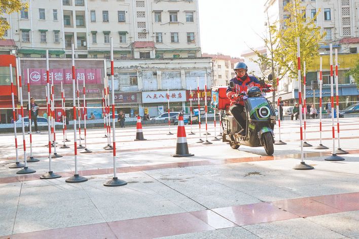 当天上午,在经过紧张的理论考试后,便进入到精彩的实操考试。参赛选手按照竞赛要求,在取餐前准备环节依次正确佩戴头盔、检查装备并对餐箱进行消毒;在取餐中,对照订单要求进行校验,发现错误及时要求商家更换或提醒商家改正。在模拟配送过程中,竞赛设置过弯道、过斑马线、过环形路等环节,模拟各种复杂的路况,要求骑车不仅做到“快稳准”,而且还要注意交通安全,文明参与交通。