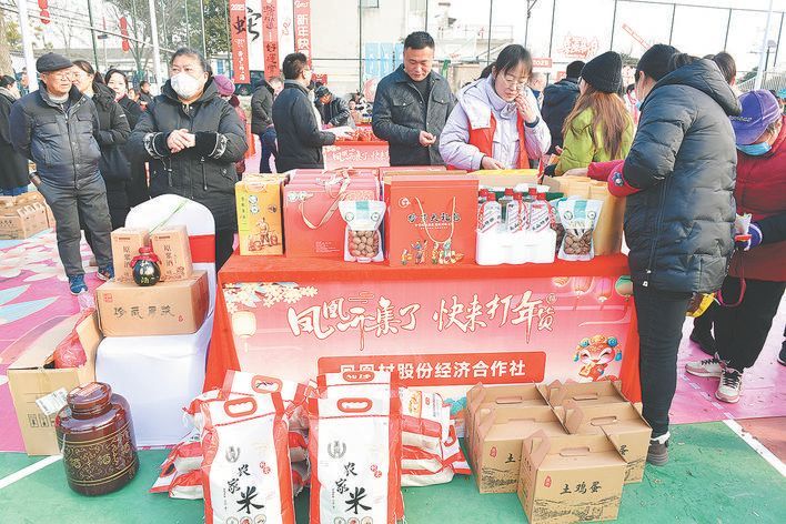 作为承办村,凤凰村在此次赶年货大集上也是做足了准备。碧根果油、碧根果、农家米、土鸡蛋、袋装坚果、葵花籽……展位前摆放得满满当当。“除了传统农业耕种外,近年来,文旅产业运营、碧根果种植已成为我们村集体经济发展新引擎。”凤凰村党委书记、村委会主任马从海说,“2024年,我们村经营性收入172万元,其中经营收益超50万元。预计2025年经营性收入可突破200万元。”