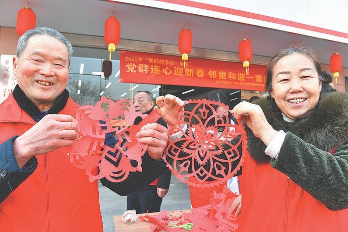 米糕制作现场,香气弥漫,居民们排着队品尝。通过制作和分享米糕,让居民享受美食,促进邻里和谐,传承和弘扬传统文化。在冰糖葫芦制作现场,社区志愿者带着提前串好的山楂、葡萄、橘子,用电锅熬制糖浆并加工完成一串串甜蜜的糖葫芦。在“好运滚滚来”游戏现场,居民们通过将手中的小球滚落到不同区域,赢得茶杯、花露水等小礼品。在“剪窗花”展台前,家长和小孩子一道在社区志愿者指导下,用手中的剪刀剪出各式各样的图案,共同感受剪纸艺术的魅力。此外,居民在现场还能享受到爱心义剪、领取春联福字等服务。