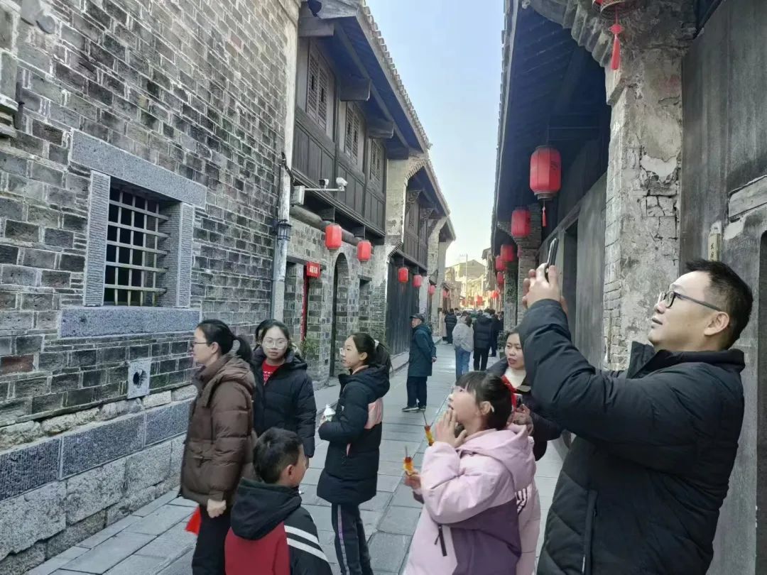 人们常说,最有年味的地方在乡村。春节期间,巢湖市众多乡村旅游点举办了各具特色的非遗民俗体验活动,营造了浓浓年味。在东庵森林公园,游客们纷纷在“新年快乐”打卡墙边排队敲锣,以响亮的锣声开启新岁。步入景区,非遗拓印、手工制作宋锦挂件、投壶等活动让大家在亲近自然的过程中感受到传统文化的魅力,留下美好的春节记忆。凤栖梧民宿内张灯结彩,热闹非凡,游客们穿梭在特色小院内,欣赏乡村风光,感受浓郁的节日氛围。最火爆的当属民宿团圆饭,大家携家人朋友相聚在一起,互道祝福、分享美食、体验非遗活动,享受一家人的团圆时刻。柘皋老街热闹非凡,李鸿章当铺内游客络绎不绝,柘皋早茶生意火爆。