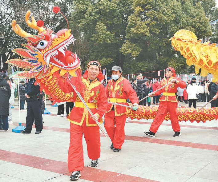 上午9时,活动在大鼓舞《红红火火》锣鼓喧天的热闹声中拉开帷幕。紧接着,在舞龙《双龙庆新春》表演中,队员们挥臂跳跃,两条“巨龙”时而翻腾跳跃,时而盘旋缠绕,整齐划一的动作、娴熟的技巧和默契的配合,赢得了观众们的阵阵掌声和欢呼声;舞狮《祥狮献瑞》表演中,舞狮队员跟随欢快的鼓点,腾挪跳跃、摇头摆尾,动作神态惟妙惟肖、活灵活现。
