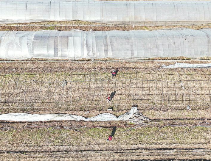 2月18日,宏扬家庭农场工人在拆除老育秧大棚骨架和棚膜。