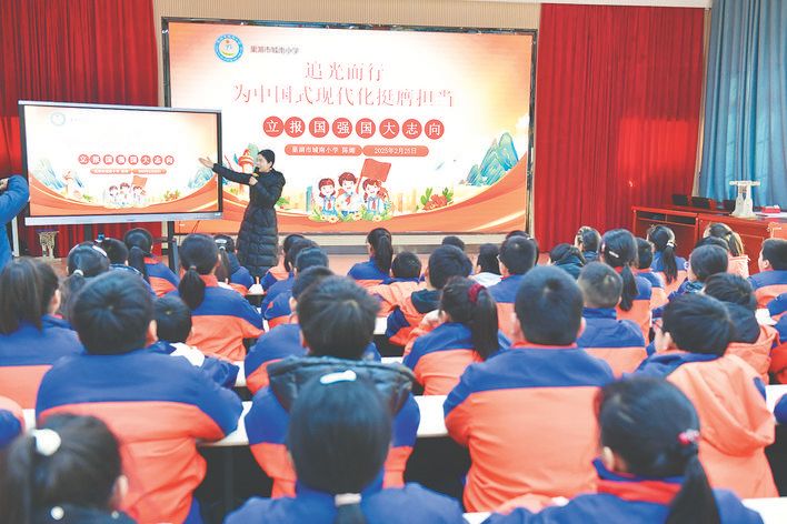 2月25日下午,巢湖市城南小学“立报国强国大志向”思政课开讲,副校长陈嫄以“追光而行,为中国式现代化挺膺担当”为主线,为六年级2个班级近百名少先队员带来一场涤荡心灵的思想洗礼,在开学之际点燃少年学子“立报国强国大志向”的理想信念之火。