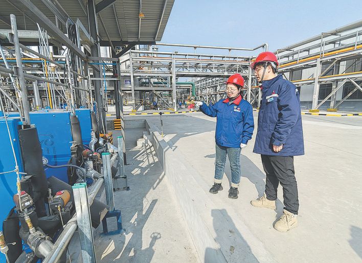 宋孟璐(左)与科研团队成员在厂区查看乙烯蒸发器设备。