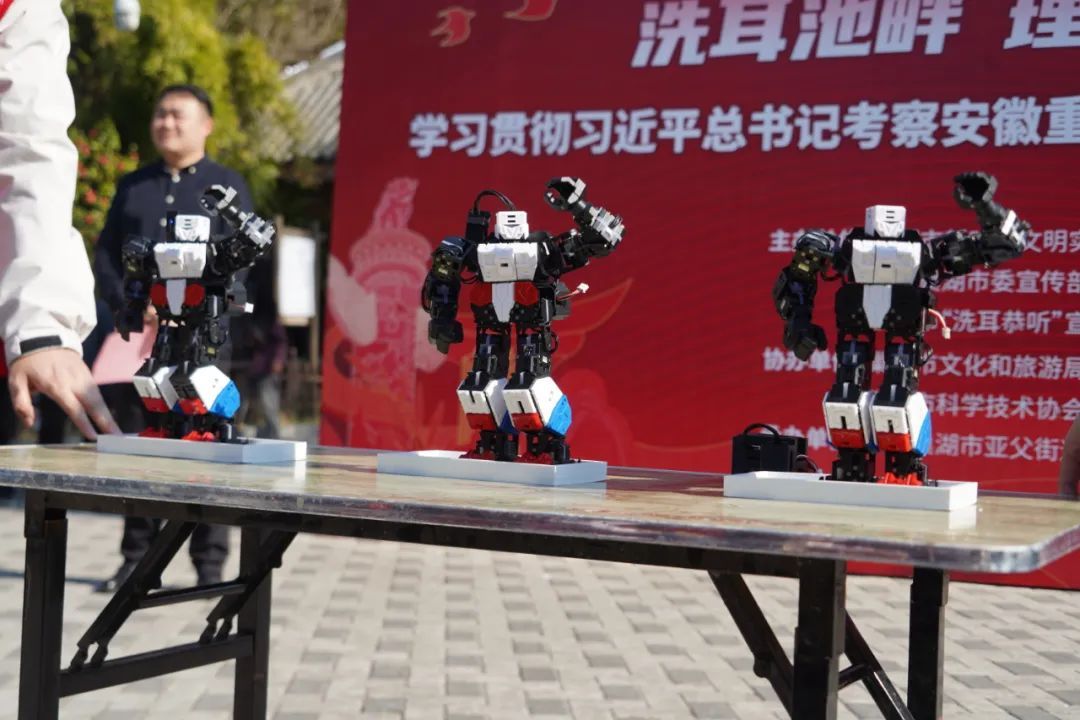 “今年的春晚大家一定看了吧?除了传统的歌舞小品节目,机器人也上台丢手绢了。今天我也带来了跳舞机器人和3D打印机,先给大家表演一段……”科技工作者代表、巢湖市青少年科技辅导员协会会长汤鹏带来题为《科技创新,让生活更美好》的理论宣讲,他结合近期引发热议的“春晚跳舞机器人”“哪吒2”以及合肥科学岛等话题,讲述了新时代科技改变生活的美好故事。现场,伴随着欢快的节奏,几台机器人登台亮相,跳起了轻快的舞蹈,整齐划一的舞蹈动作,引得围观市民纷纷举起手机拍摄。附近市民陈玉恒捧着现场展示的3D打印模型玩具龙赞叹不已,“这么好看的龙,竟然是3D打印机打印出来的,不得不说,科技的力量是不得了啊!”
