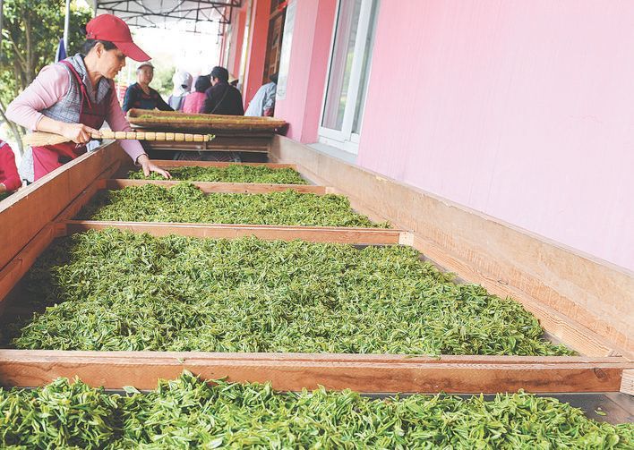 山上采茶忙,山下制茶香。在制茶车间内,茶叶的加工设备不停运转,经过摊青、杀青、干燥等工序,一片片脆嫩的鲜叶变成清香扑鼻、入口醇厚甘爽的绿茶和白茶,销往本地及省内外。