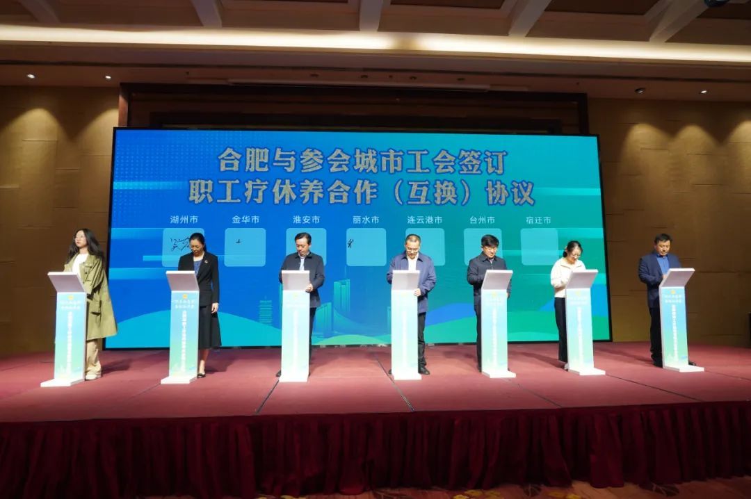 与会人员共同观看了合肥市和巢湖市宣传片,出席活动领导共同按下启动键,启动本次交流推介活动。在宣传推介环节,肥东县、肥西县、巢湖市、长丰县、庐江县,以及创信(黄山)酒店疗休养基地依次推介了各自合作成果,展示合作带来的效益。合肥市总工会与参会城市工会签订了职工疗休养合作(互换)协议。