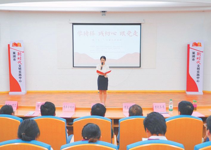 6月30日下午,巢湖市新时代文明实践中心报告厅内气氛热烈而庄重,“学榜样 践初心 跟党走”迎“七一”主题宣讲活动在此火热上演。当天的活动将崇高信仰、榜样力量与故事化宣讲、艺术化表达巧妙融合,用丰富语言讲活红色故事,让身边榜样点亮城市精神。