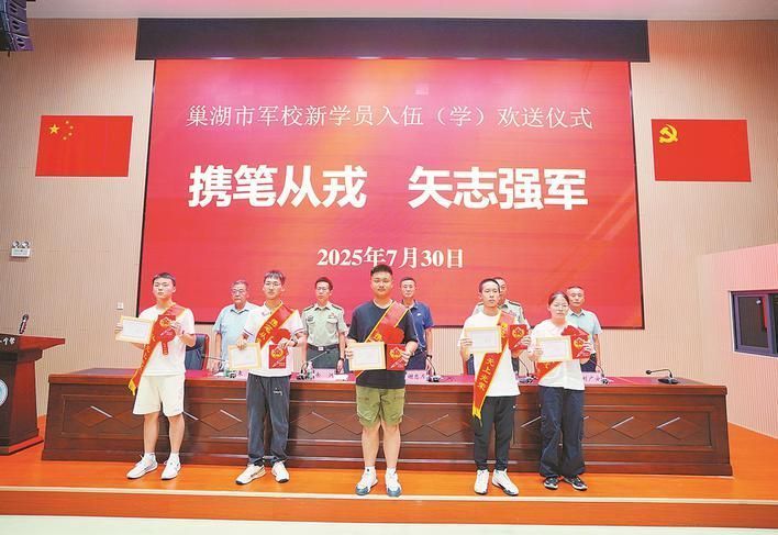 7月30日,2025年巢湖市军校新学员入伍(学)欢送仪式在巢湖一中举行。巢湖市委常委、市政府副市长谢忠月,市委常委、人武部部长孙健,人武部政委余洲等军地领导,与学校老师、学生家长齐聚一堂,共同为即将踏入军营的23名优秀学子壮行,分享军地携手共育英才的喜悦,见证家乡儿女的报国壮志。